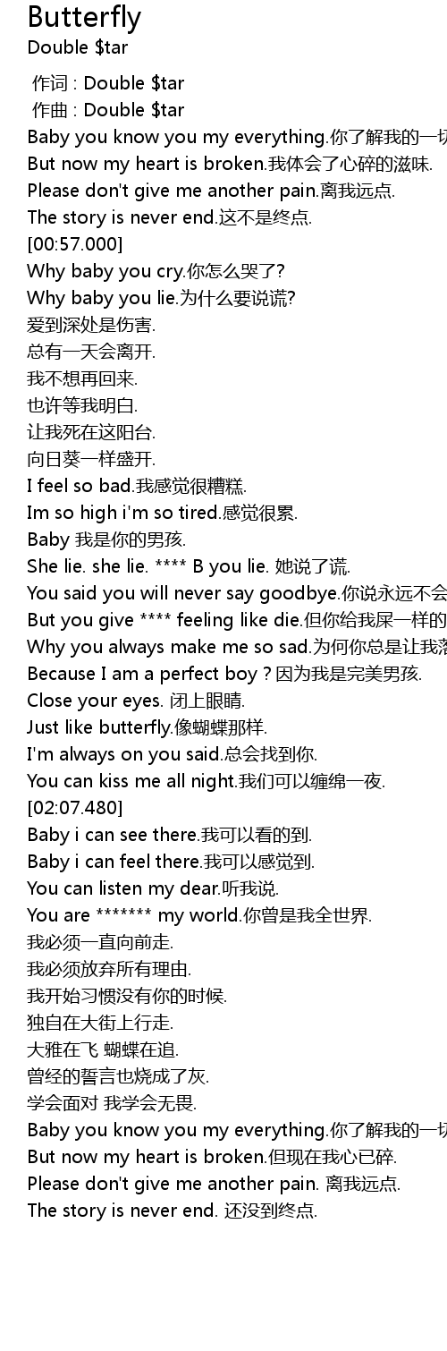 | [01:58.896] | Just like butterfly. xiàng hú dié nà yàng. |