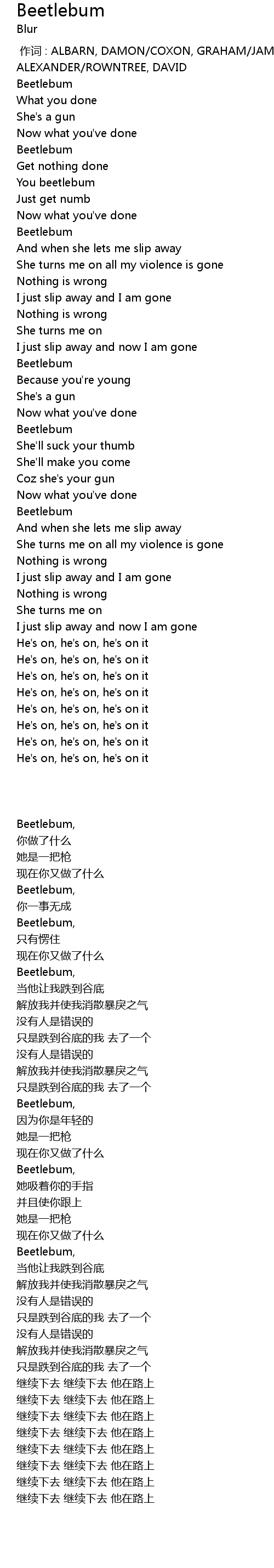 | [00:00.00] | 作词 : ALBARN, DAMON/COXON, GRAHAM/JAMES, STEVEN ALEXANDER/ROWNTREE, DAVID |