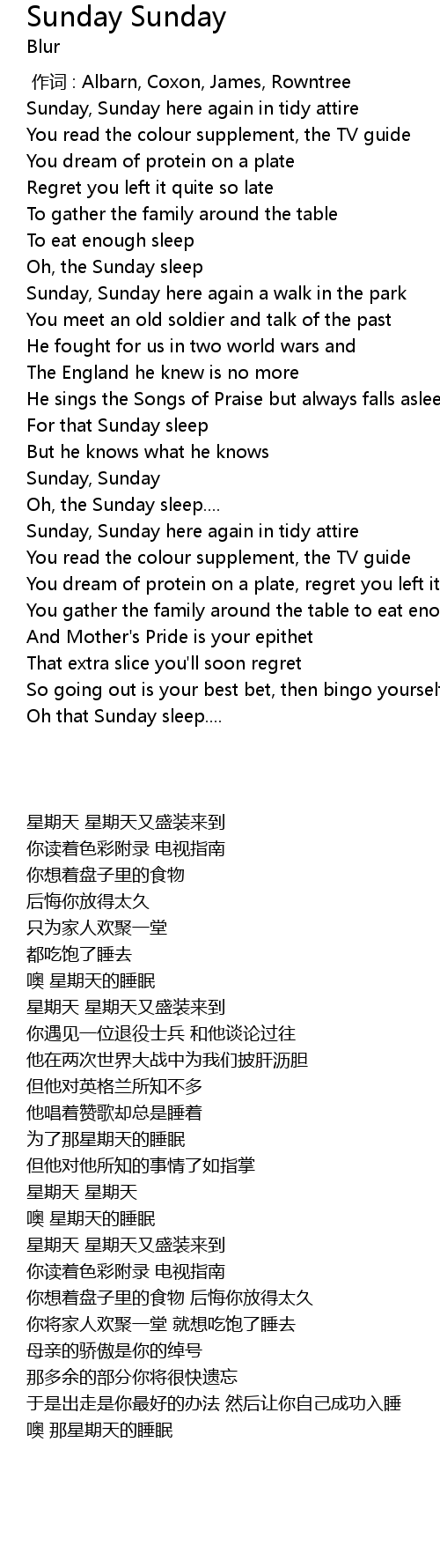 | [00:16.15] | Sunday, Sunday here again in tidy attire |