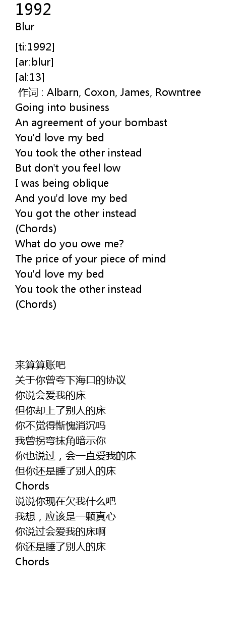 | [00:00.00] | 作词 : Albarn, Coxon, James, Rowntree |