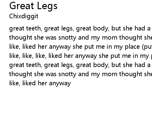 | great teeth, great legs, great body, but she had a bad attitude all my friends thought she was snotty and my mom thought she was rude but i like, like, like, like, liked her anyway she put me in my place (put me in my place) but i like, like, like, like, liked her anyway she put me in my place (put me in my place) great teeth, great legs, great body, but she had a bad attitude all my friends thought she was snotty and my mom thought she was rude but i like, like, like, like, liked her anyway |