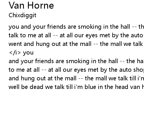 you and your friends are smoking in the hall -- the hall i never thought you'd talk to me at all -- at all our eyes met by the auto shop -- the shop then we went and hung out at the mall -- the mall we talk till i'm blue in the head cuz we as well be dead we talk till i'm blue in the head van horne <i>[x3]</i> you and your friends are smoking in the hall -- the hall i never thought you'd talk to me at all -- at all our eyes met by the auto shop -- the shop then we went and hung out at the mall -- the mall we talk till i'm blue in the head cuz we as well be dead we talk till i'm blue in the head van horne [x3] |