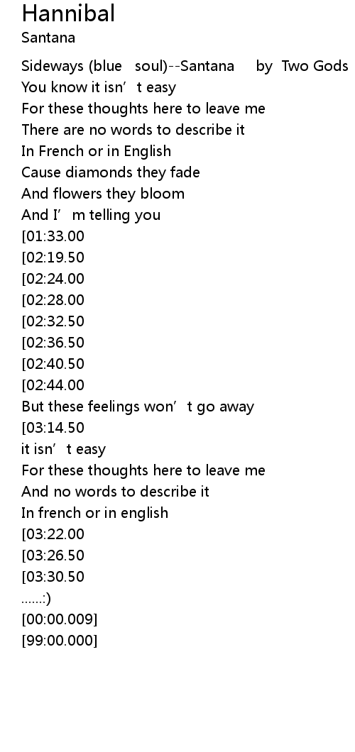 | [00:00.100] | Sideways blue soul Santana by Two Gods |