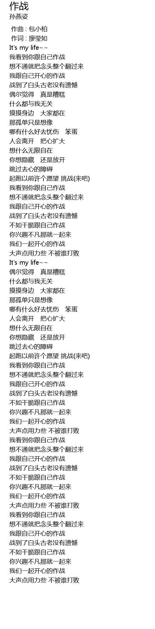 | [00:23.138] | wǒ gēn zì jǐ kāi xīn de zuò zhàn |