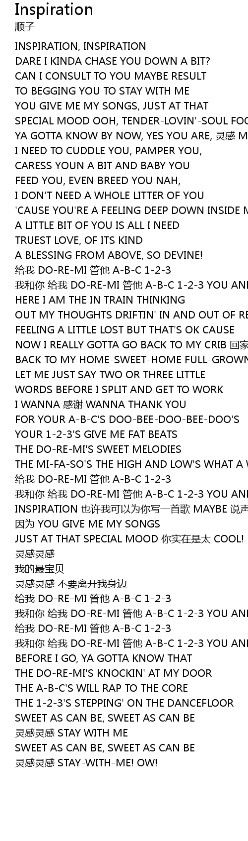 | [02:09.67] | INSPIRATION 也许我可以为你写一首歌 MAYBE 说声谢谢 |