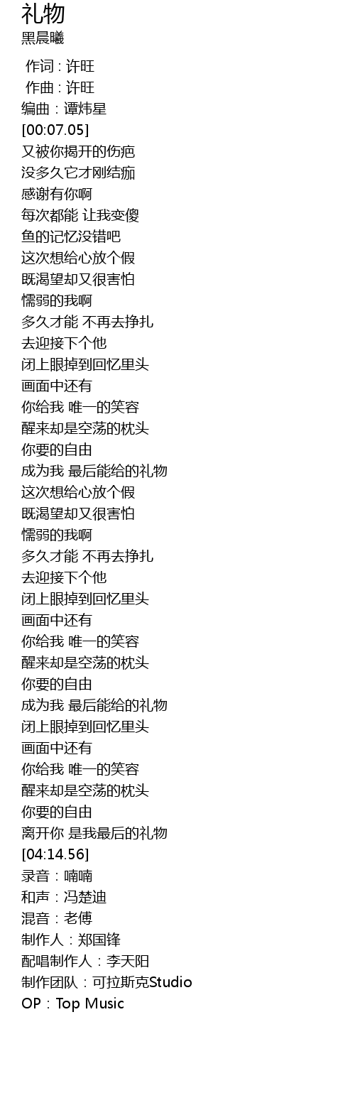 | [04:06.27] | 离开你 是我最后的礼物 |