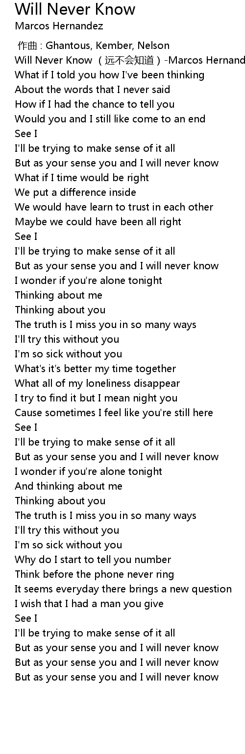| [00:00.00] | Will Never Know yuan bu hui zhi dao Marcos Hernandez |