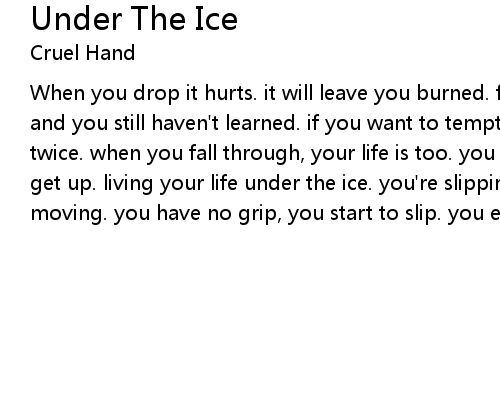 | When you drop it hurts. it will leave you burned. fast and now you've crashed. and you still haven't learned. if you want to tempt the ice, you better think twice. when you fall through, your life is too. you can't stand up, you can't get up. living your life under the ice. you're slipping. momentum keeps you moving. you have no grip, you start to slip. you eventually fall |
