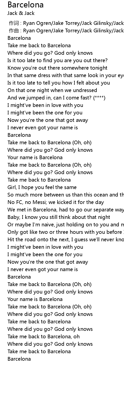 | [00:53.97] | Take me back to Barcelona (Oh, oh) |