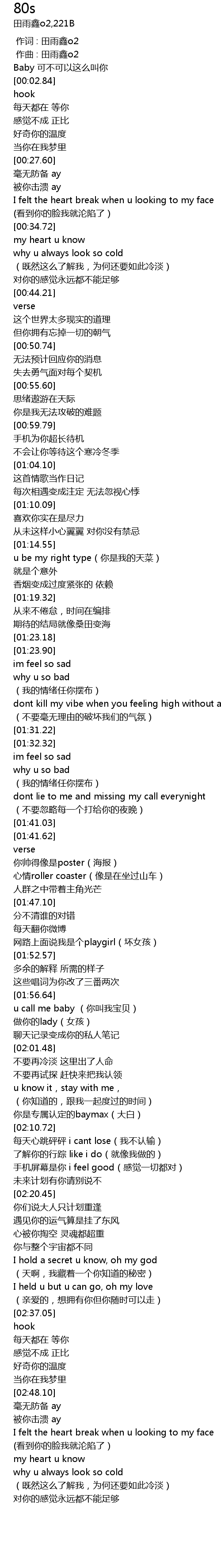 | [00:00.000] | 作词 : 田雨鑫o2 |