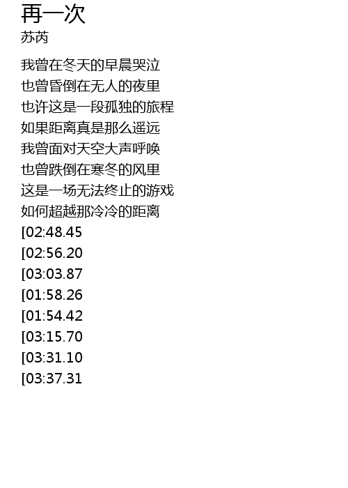| [01:46.32][01:54.42][02:02.04][03:11.75][03:19.46][03:27.20][03:39.03][03:46.69][03:54.40][04:02.17] | 再一次再一次 |