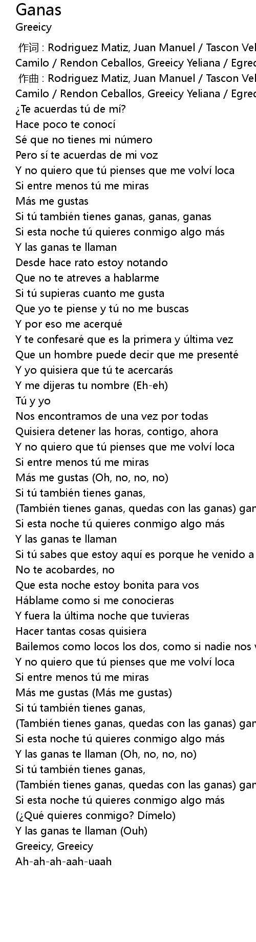 | [01:34.11] | (También tienes ganas, quedas con las ganas) ganas, ganas |