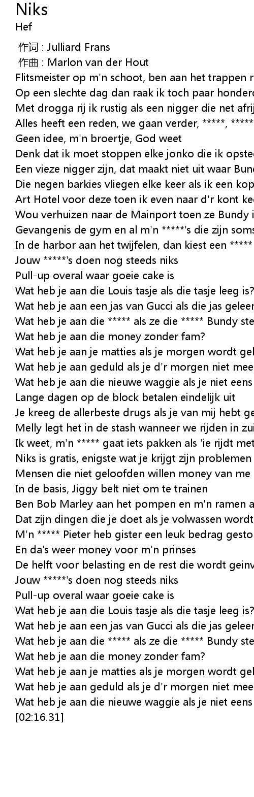 | [00:58.69] | Wat heb je aan die ***** als ze die ***** Bundy steeds mist? |
