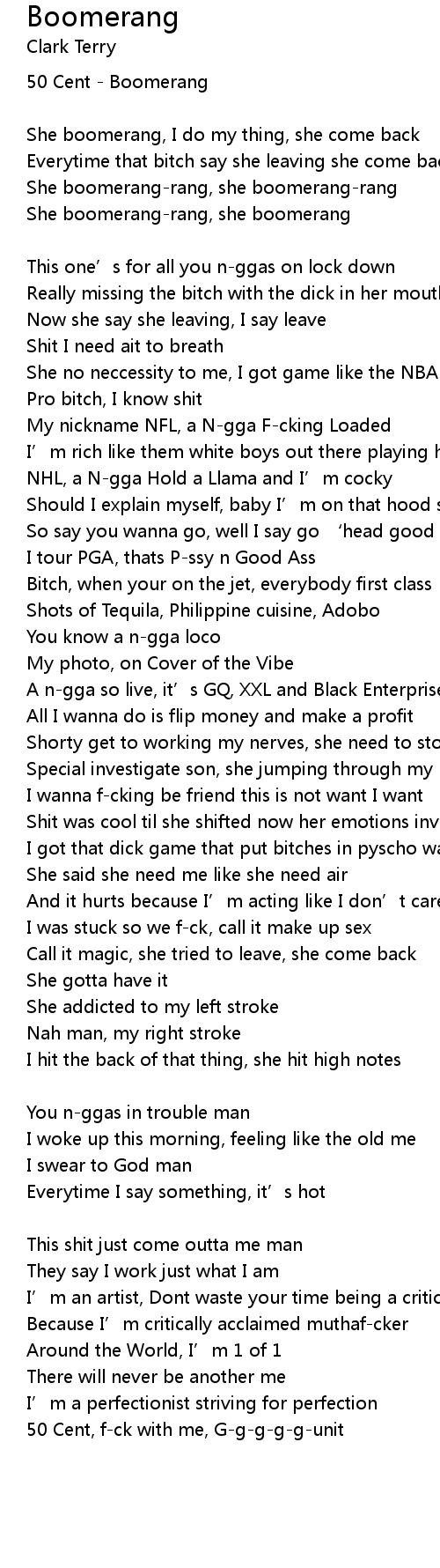 | She boomerang, I do my thing, she come back | |