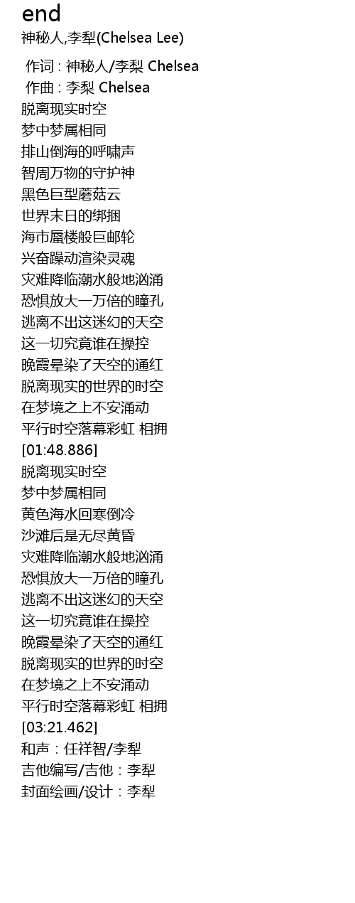 | [00:00.000] | 作词 : 神秘人/李梨 Chelsea |