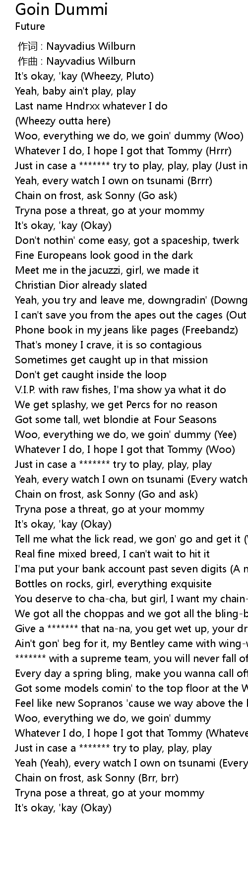| [01:56.74] | Give a ******* that na-na, you get wet up, your dream-dream |