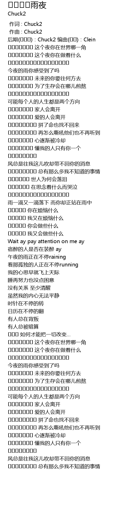| [00:03.516] | 后期(ꊁꊬꌠ):Chuck2 编曲(ꀚꐎ):Clein |