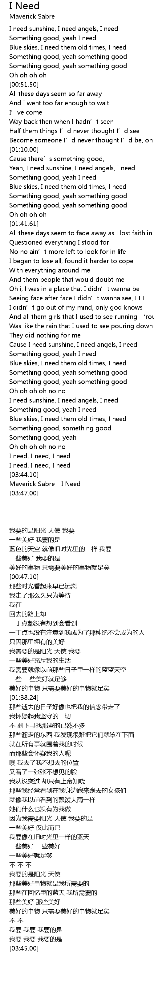 | [02:56.20] | I need sunshine, I need angels, I need |