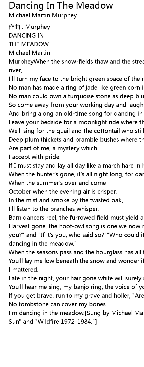 | I' m dancing in the meadow. Sung by Michael Martin Murphey on " Swans against the Sun" and " Wildfire 19721984." |