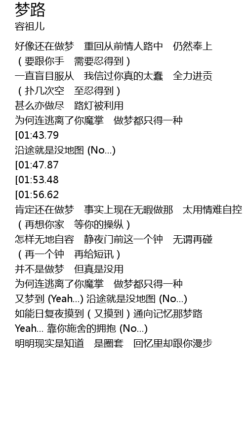| [02:27.20][01:43.79][00:56.20] | 时常做梦亦梦到 (Yeah...) 沿途就是没地图 (No...) |