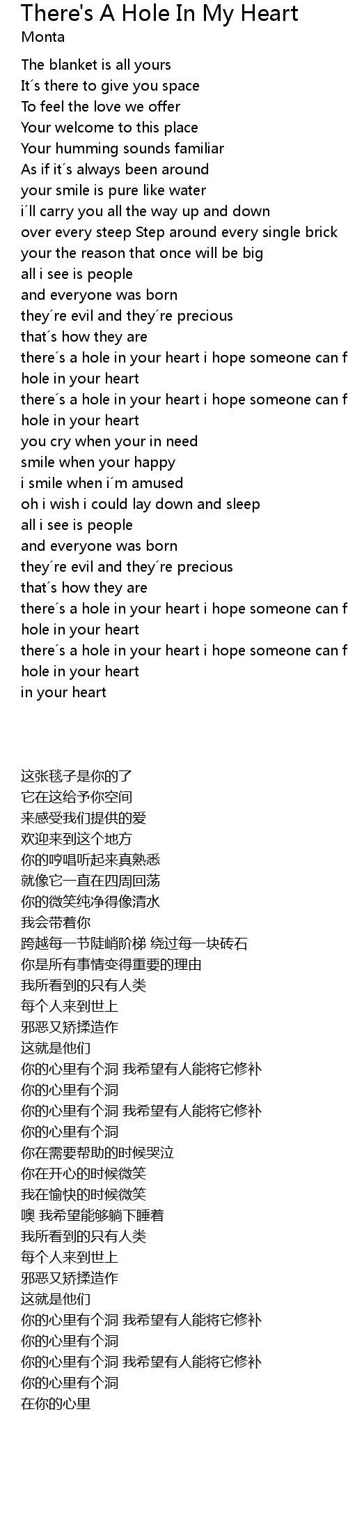 | [02:58.78] | there s a hole in your heart i hope someone can fix it |