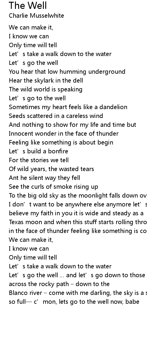 | I don' t want to be anywhere else anymore let' s go to the well you better believe my faith in you it is wide and steady as a | |