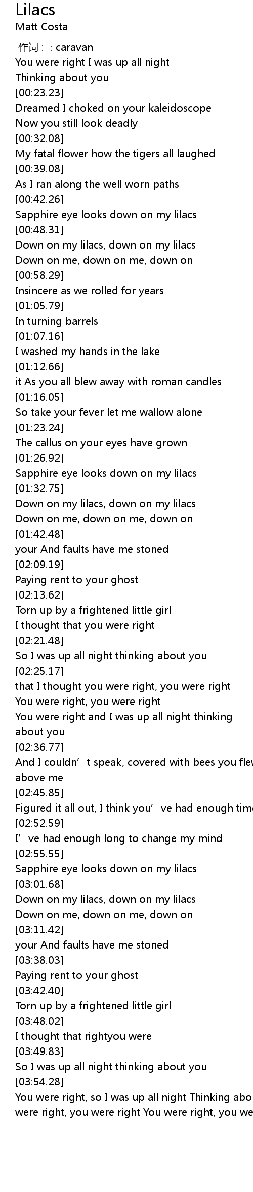 | [03:02.74] | Down on my lilacs, down on my lilacs |