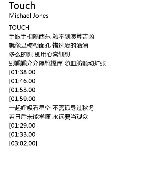 | [02:42.00][01:53.00][00:50.00] | Touch wo de xin dong wo xin shi zhong shi zhong shi kong |