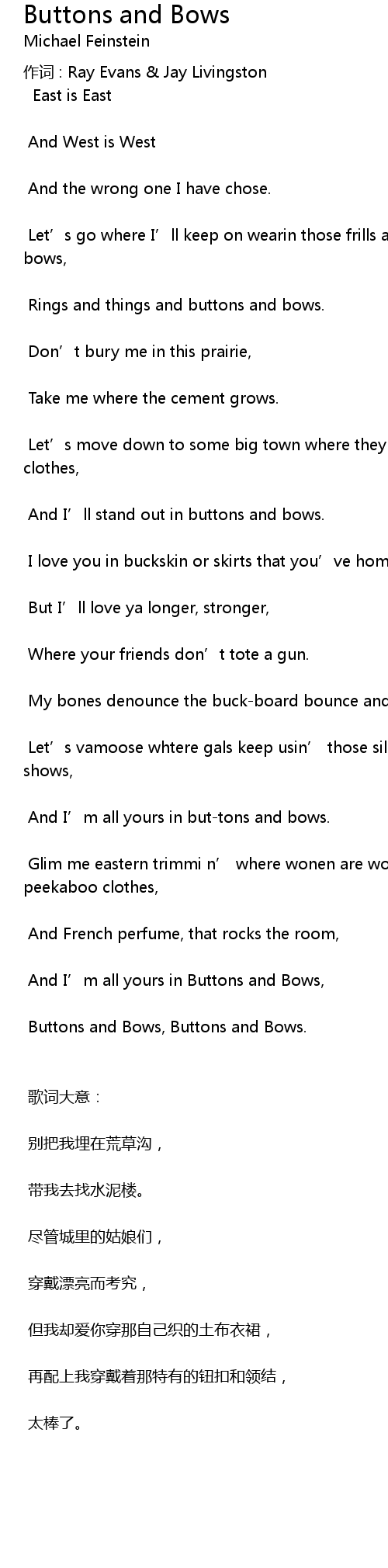 | Let' s go where I' ll keep on wearin those frills and flowers and butons and bows, | |