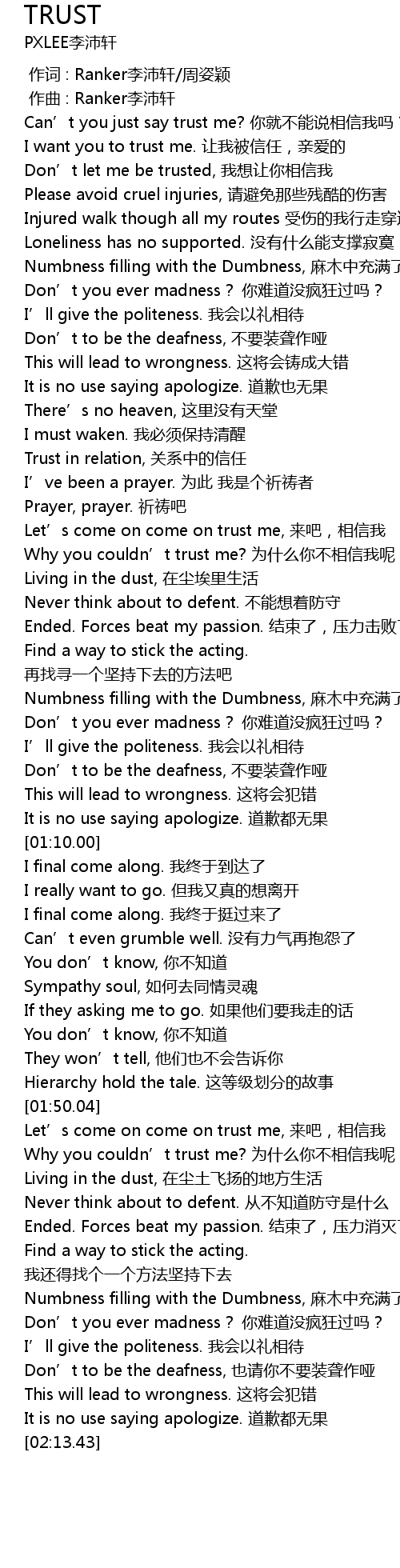 | [00:34.86] | Trust in relation, guān xì zhōng de xìn rèn |