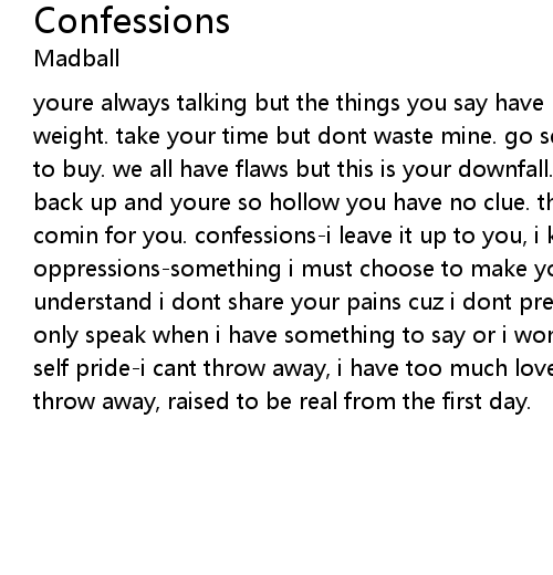 youre always talking but the things you say have no meaning, they carry no weight. take your time but dont waste mine. go sell your stories im not looking to buy. we all have flaws but this is your downfall. talkin a game you cant even back up and youre so hollow you have no clue. theres repercussions and theyre comin for you. confessions-i leave it up to you, i know where i stand. oppressions-something i must choose to make you understand. to make you understand i dont share your pains cuz i dont preach about pointless things. i only speak when i have something to say or i wont fake moves disgrace my name. self pride-i cant throw away, i have too much love for family. self pride-i wont throw away, raised to be real from the first day.