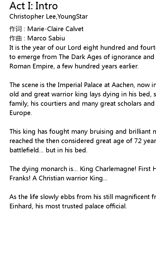| The scene is the Imperial Palace at Aachen, now in modern day Germany, where an old and great warrior king lays dying in his bed, surrounded by his noble family, his courtiers and many great scholars and churchmen from all over Europe. | |