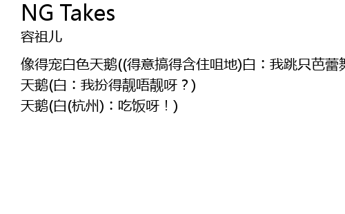 | [00:02.03] | 像得宠白色天鹅((得意搞得含住咀地)白︰我跳只芭蕾舞俾你睇呢?!) |