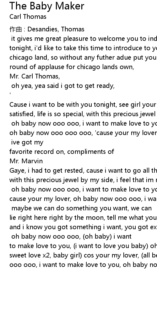 | Gaye, i had to get rested, cause i want to go all the way, life is so special, with this precious jewel by my side, i feel that im ready to love you, [chorus x2] oh baby now ooo ooo, i want to make love to you, oh baby now ooo ooo ooo, cause your my lover, oh baby now ooo ooo, i want to make love to you, oh baby now ooo, i want to love you, [bridge] maybe we can do something you want, we can lie right here right by the moon, tell me what you want to do, its up to you, and i know you got something i want, you got exactly what i need, (what I neeeed) i want to love you... [chorus x2] oh baby now ooo ooo, (oh baby) i want to make love to you, (i want to love you baby) oh baby now ooo ooo ooo, (make sweet love x2, baby girl) cos your my lover, (all because your mine) oh baby now ooo ooo, i want to make love to you, oh baby now ooo, i want to love you, |