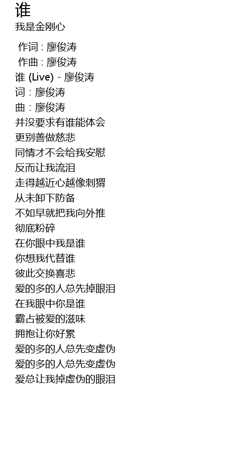 | [00:04.008] | 谁 (Live) - 廖俊涛 |