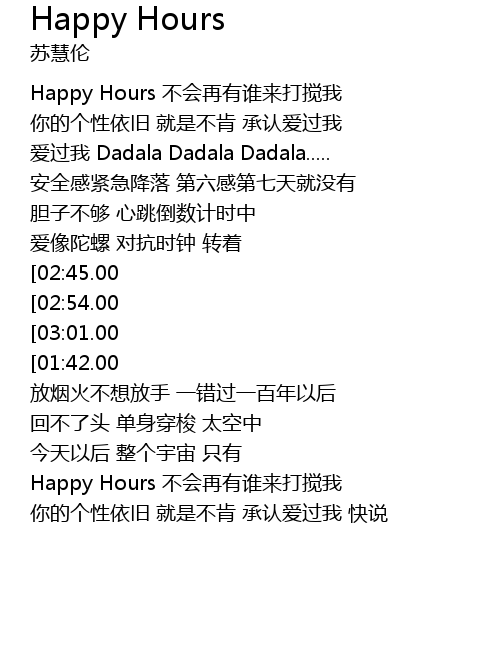 | [03:37.00][02:45.00][01:18.00] | Happy Hours 不会再有谁来打搅我 HO.... |