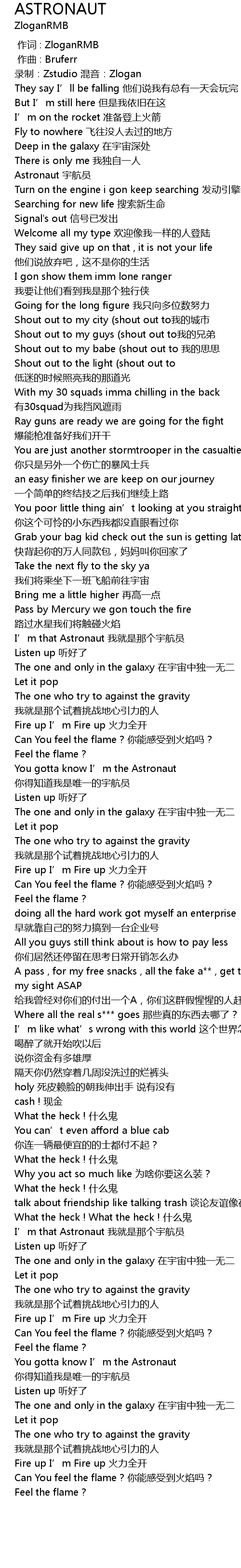 | [02:34.74] | You gotta know I’m the Astronaut 你得知道我是唯一的宇航员 |