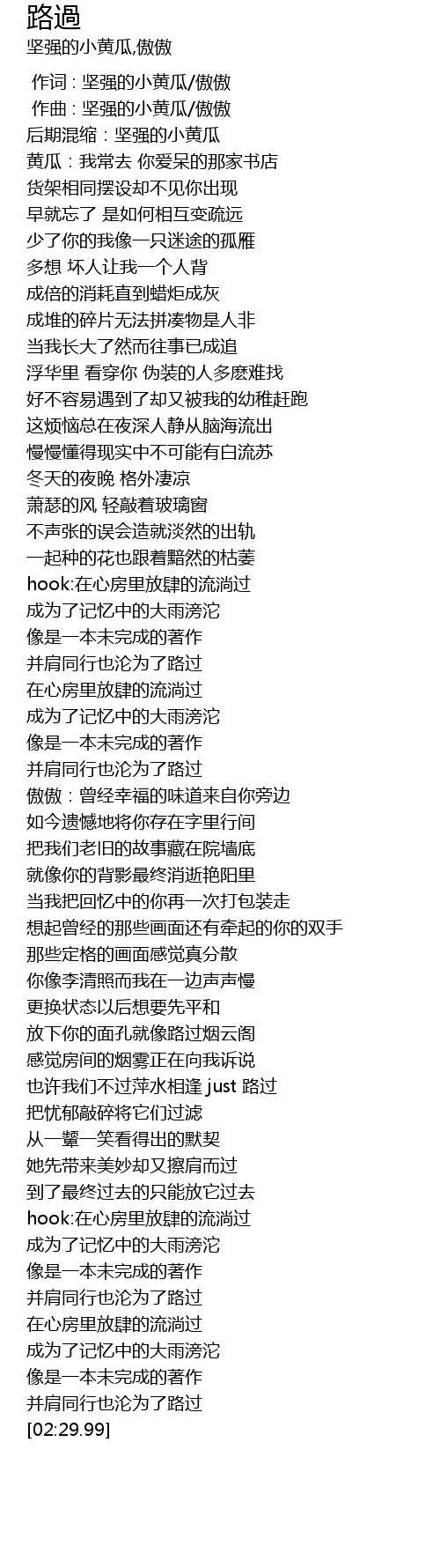 | [00:00.000] | 作词 : 坚强的小黄瓜/傲傲 |