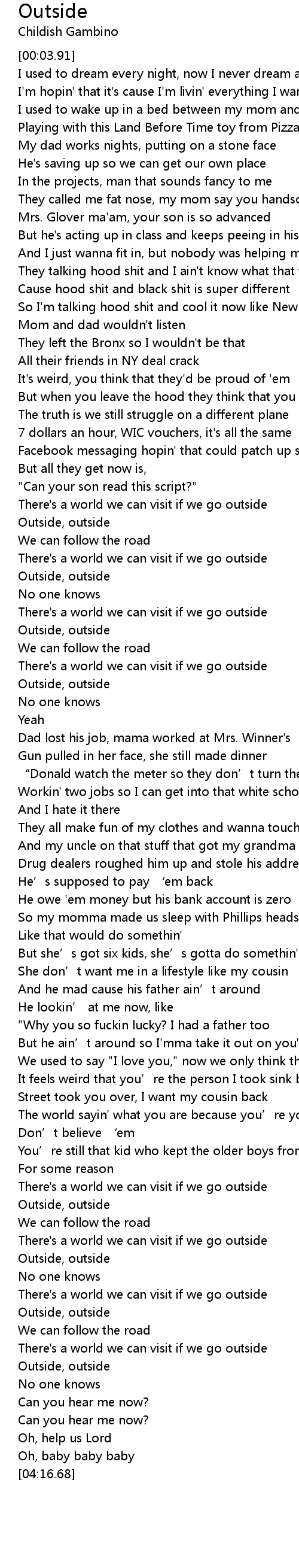 | [03:23.74] | Outside, outside |