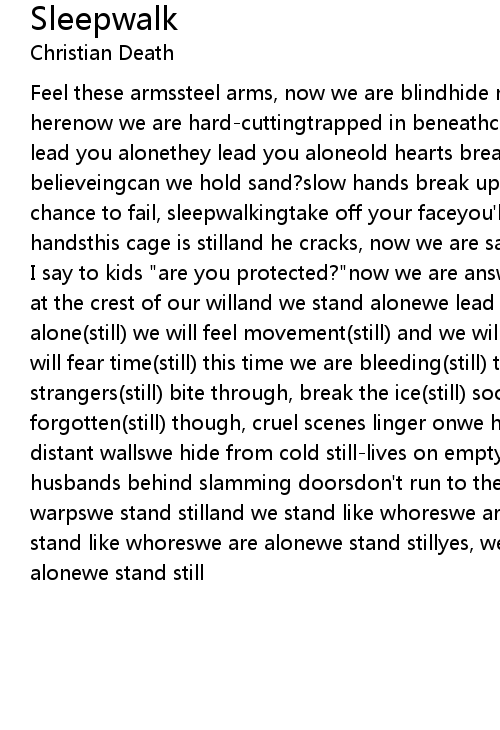 | Feel these armssteel arms, now we are blindhide my eyesmy eyes so out of place herenow we are hard-cuttingtrapped in beneathcold-loving mirrors stand alonethey lead you alonethey lead you aloneold hearts break downfootsteps tied till believeingcan we hold sand?slow hands break up the familywe all fall downone chance to fail, sleepwalkingtake off your faceyou'll learn to trust my dry handsthis cage is stilland he cracks, now we are safertrue dreams stay west | |