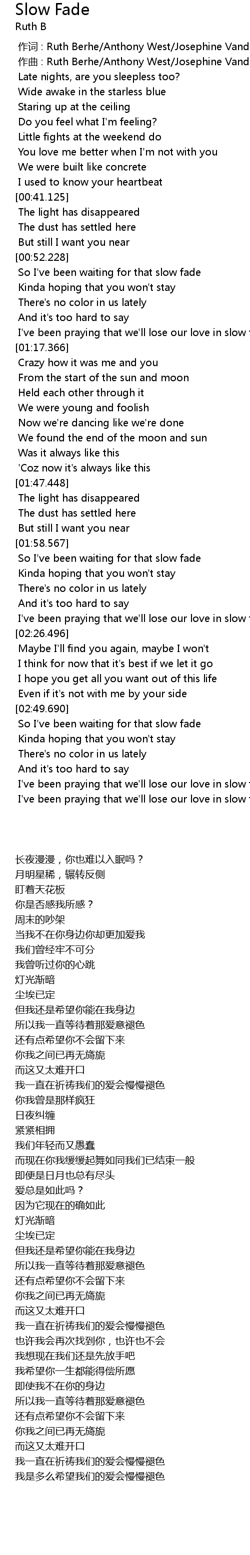 | [03:14.436] | I've been praying that we'll lose our love in slow fade |