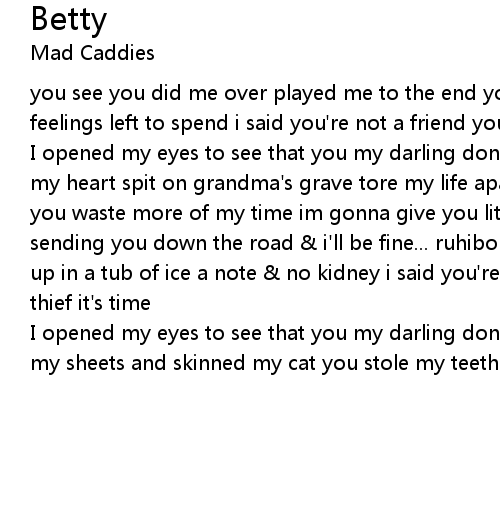 I opened my eyes to see that you my darling don't deserve my sympathy you broke my heart spit on grandma's grave tore my life apart never left the same before you waste more of my time im gonna give you little piece of my mind... i'm sending you down the road & i'll be fine... ruhibonol you gave it to me i woke up in a tub of ice a note & no kidney i said you're not a friend you're just a thief it's time |