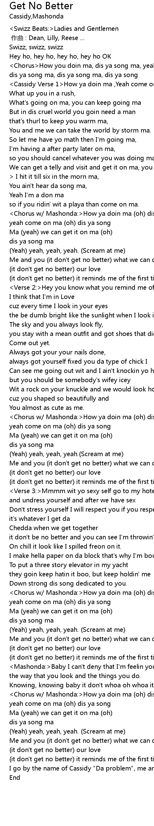 | [00:53.99] | <Chorus w/ Mashonda:>How ya doin ma (oh) dis ya song ma (yeah) |