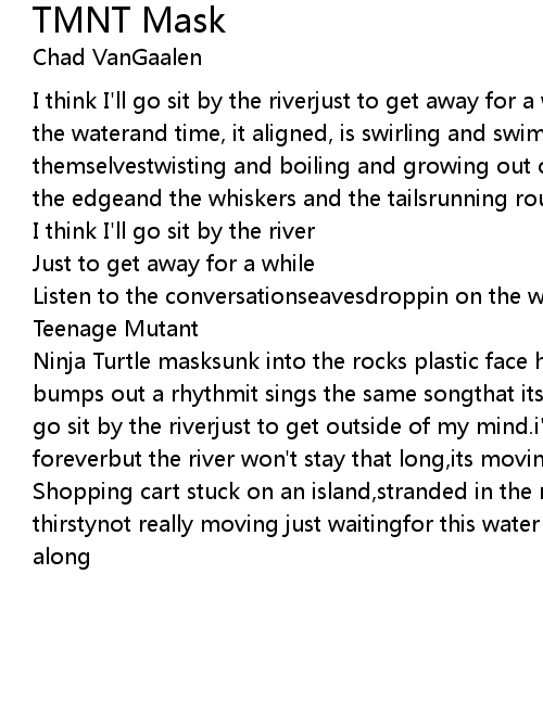 Ninja Turtle masksunk into the rocks plastic face half buriedthe stone bottom bumps out a rhythmit sings the same songthat its always been singingthink i'll go sit by the riverjust to get outside of my mind.i'm wishing i could stay here foreverbut the river won't stay that long,its moving on.