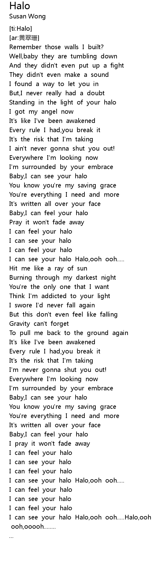 | [03:22.203] | I can see your halo Halo,ooh ooh.....Halo,ooh ooh.....Halo,ooh ooh,ooooh........ |
