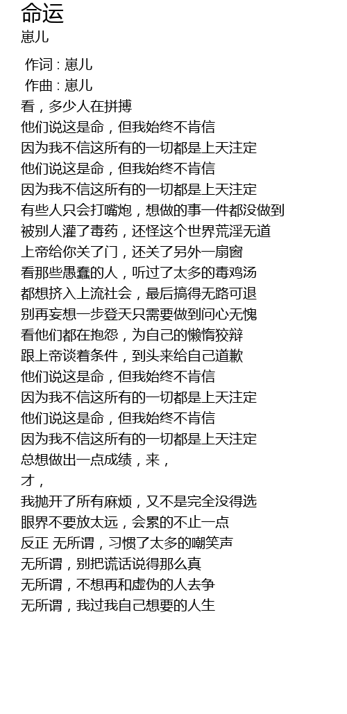 | [00:33.89] | 他们说这是命,但我始终不肯信 |
