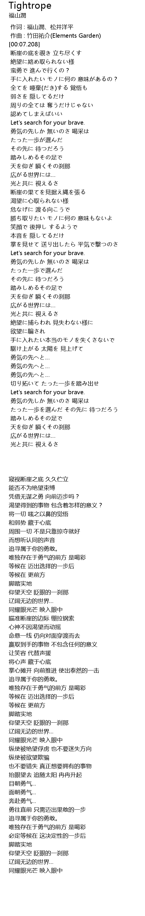 | [01:17.676] | 瞄准断崖的边际 绷拉钢索 |