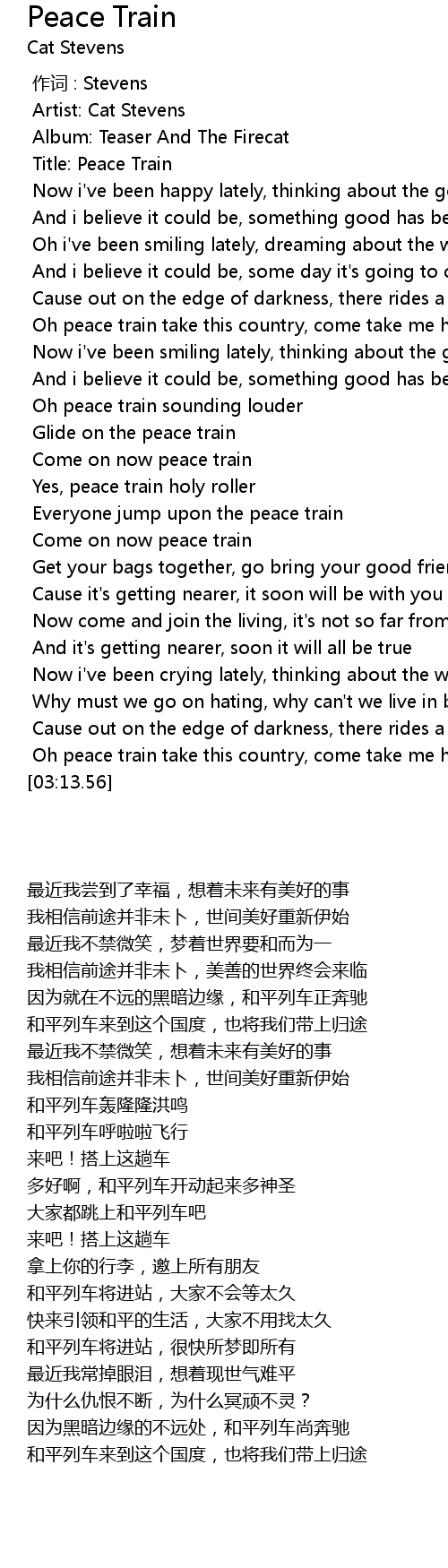 | [00:12.39] | Title: Peace Train |