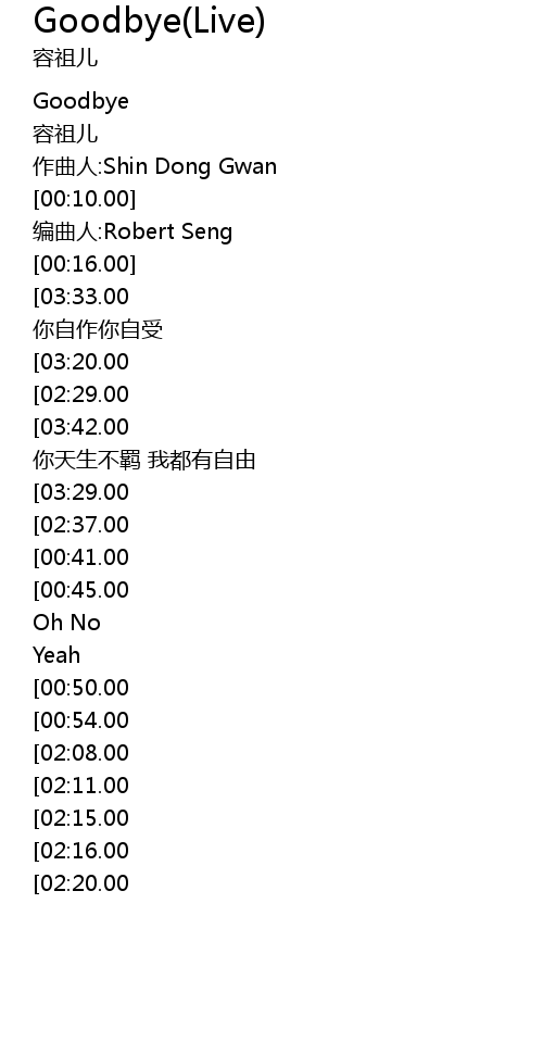| [03:59.00][03:42.00][03:25.00][02:33.00][01:24.00][00:32.00] | Goodbye nǐ tiān shēng bù jī wǒ dōu yǒu zì yóu |
