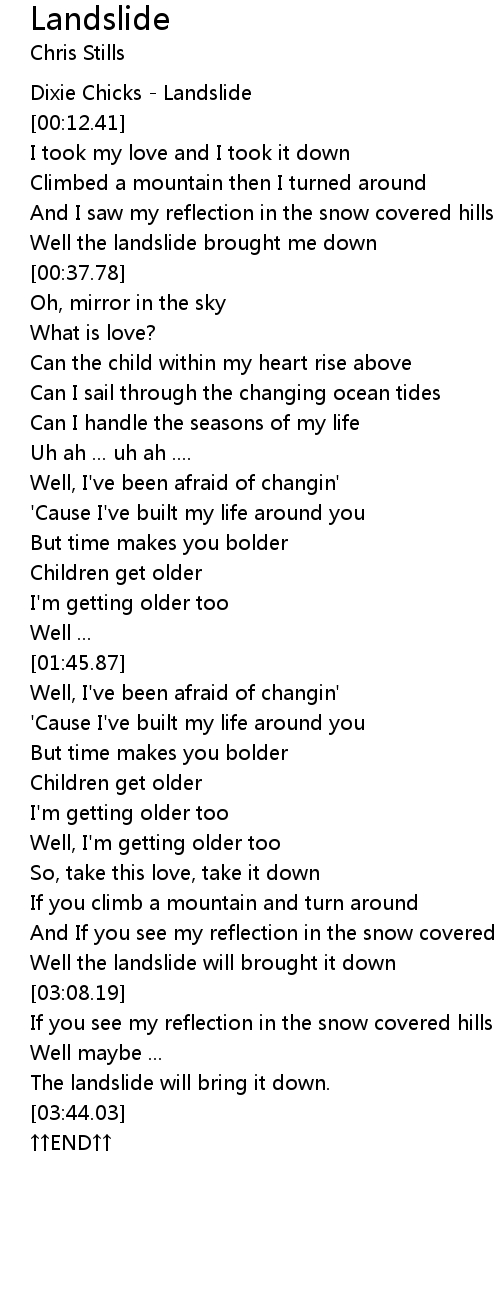 | [00:25.91] | And I saw my reflection in the snow covered hills |